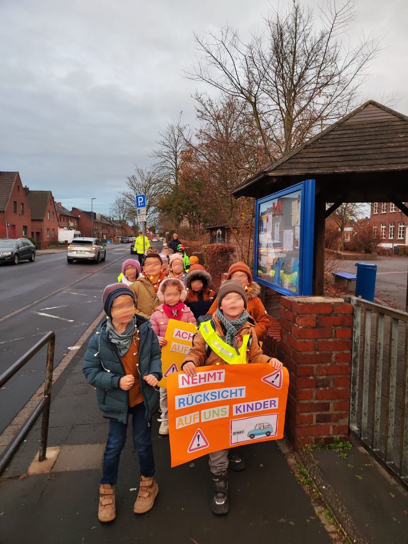 Von Ihren Eltern wurden die Kinder dazu mit reflektierender Kleidung, Taschenlampen Lichterketten und Blinkies ausgestattet und beleuchtet. Unser Ziel war es, den Verkehrsteilnehmenden zu signalisieren: "Auch wenn wir klein sind, sind wir ebenfalls Teil des Straßenverkehrs und möchten sicher zur Schule kommen."