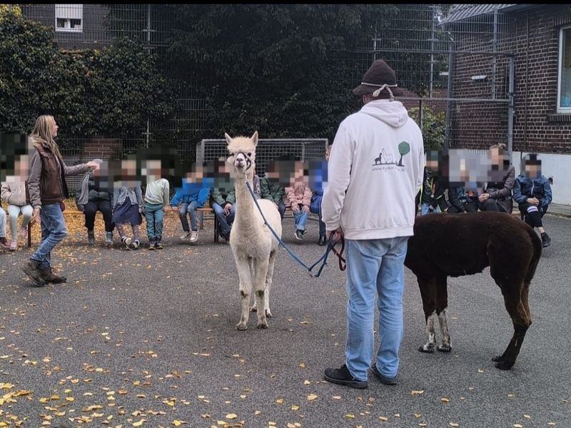 Dabei durften sie die Alpakas "Almaro" und "Sokrates" kennenlernen und einiges über die sanftmütigen Tiere erfahren: Herkunft, Haltung, Fütterung, Umgang etc. Sie hatten auch die Möglichkeit die Alpakas zu streicheln und zu füttern. Für viele war es das erste Mal einem Alpaka so nahe zu kommen - für alle ein schönes Erlebnis.